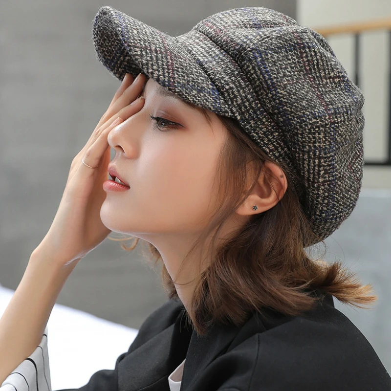 HT1991 femmes hommes laine feutre bérets haute qualité automne hiver chapeau épais chaud unisexe casquette octogonale rétro Plaid béret casquette