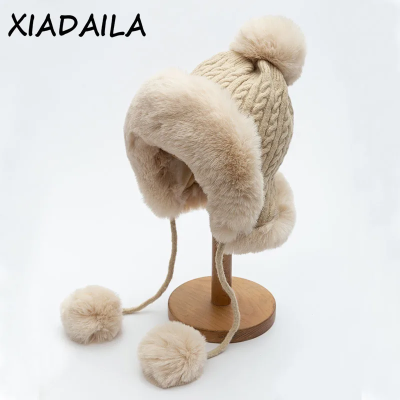 Chapeau Ă oreillettes en laine pour femme, bonnet de ski, bombardier souriant, fausse fourrure de renard Ushanka, pompon, cosaque russe, hiver
