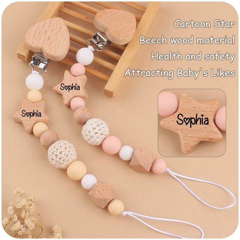 Porte-mamelon en bois avec nom personnalisé pour bébé, Clip de sucette, jouet à mâcher de qualité alimentaire, anneau de dentition pour bébé, chaîne factice, cadeau de douche