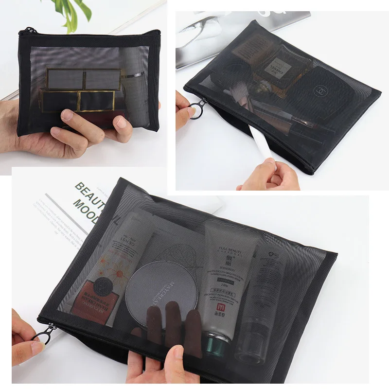 Sacs de maquillage de lavage de toilette, trousse de maquillage en maille transparente noire, pochette de rangement, sac à cosmétiques de voyage pour femmes, fermeture éclair décontractée