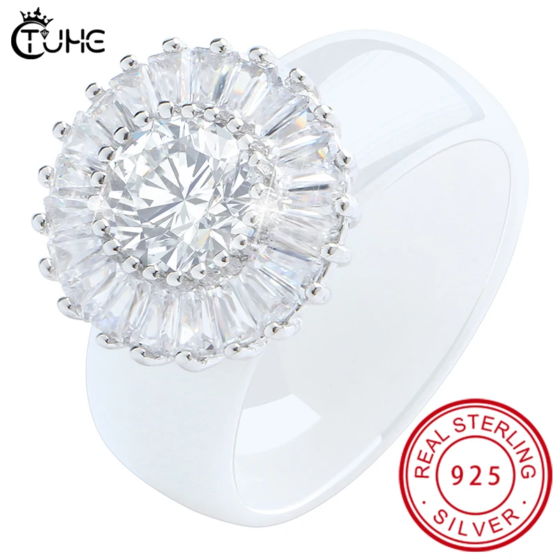 Bague en argent Sterling 100% S925 pour femmes, bague élégante en céramique Zircon CZ, motif de fleurs éblouissantes, pour anniversaire, fiançailles, mariage