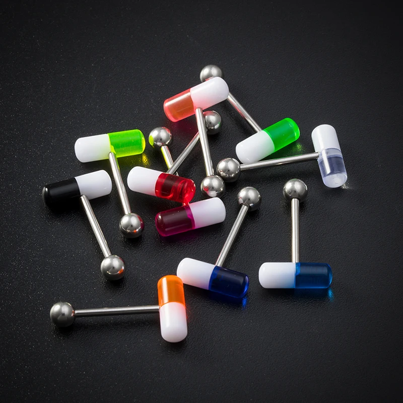 Anneaux de langue en forme de Capsule colorée, acrylique, couleur mixte, acier chirurgical, Piercing de langue pour femmes, bijoux de corps, cadeau, 1/3 pièces