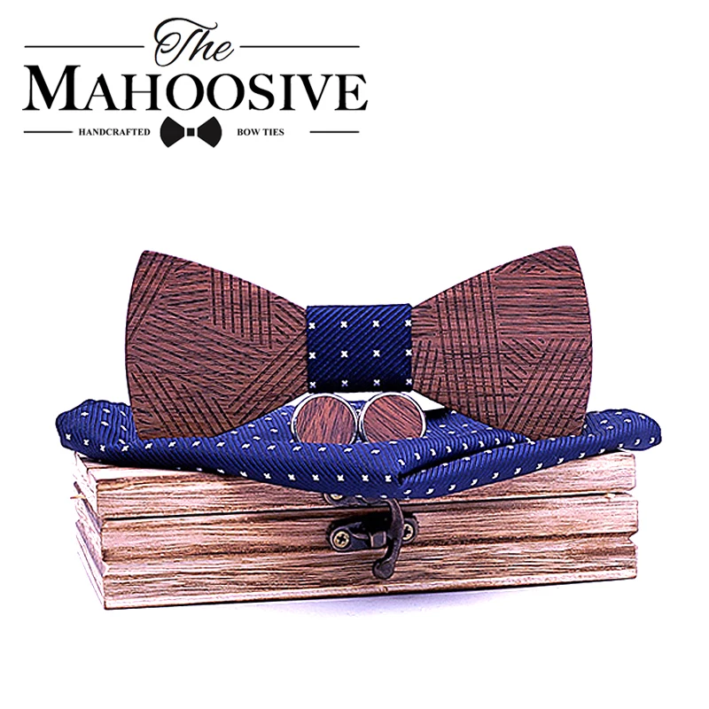 Ensemble de nœuds papillon en bois à carreaux pour hommes, ensemble de boutons de manchette et mouchoir en bois rayé avec boîte en bois, cadeau de mariage