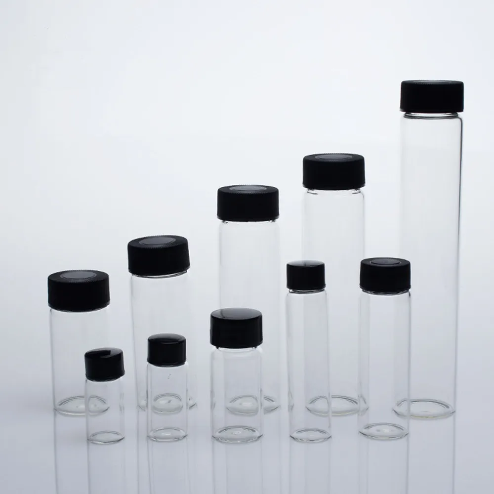 Flacons d'échantillons en verre transparent de 3 ml à 50 ml avec bouchon à vis en plastique noir, flacon d'huile essentielle pour usage en laboratoire