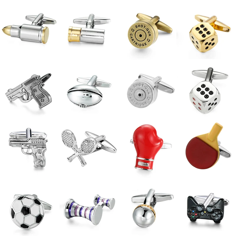 Boutons de manchette de chemise française pour hommes, matériel en cuivre, dés, football, badminton, rugby, gants de boxe, coque de balle, modèle de pistolet, bouton de manchette design