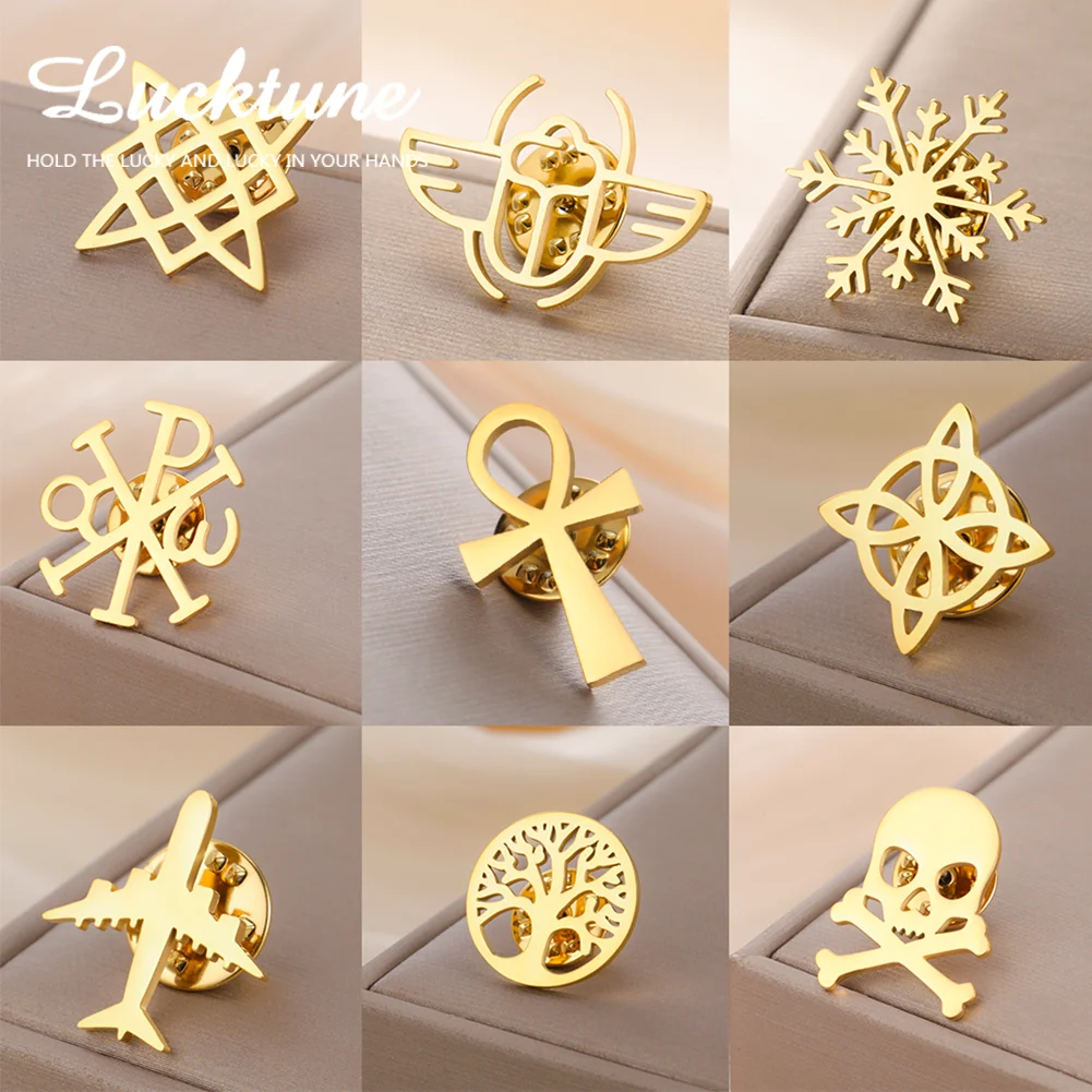 Lucktune broche en métal en acier inoxydable noeud de sorcière avion Ankh croix arbre de vie broches pour hommes femmes chemise Badges cadeau