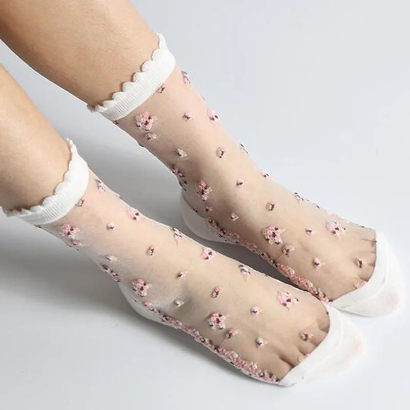 1 paire d'été mignon dentelle chaussettes courtes femmes Sexy verre soie florale respirant Ultra mince bonneterie fille Transparent élastique chaussettes