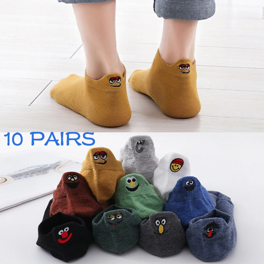 10 paires Pack hommes mâle brodé dessin animé Expression coton court cheville chaussettes ensemble drôle heureux Kawaii Couple chaussettes Calcetines
