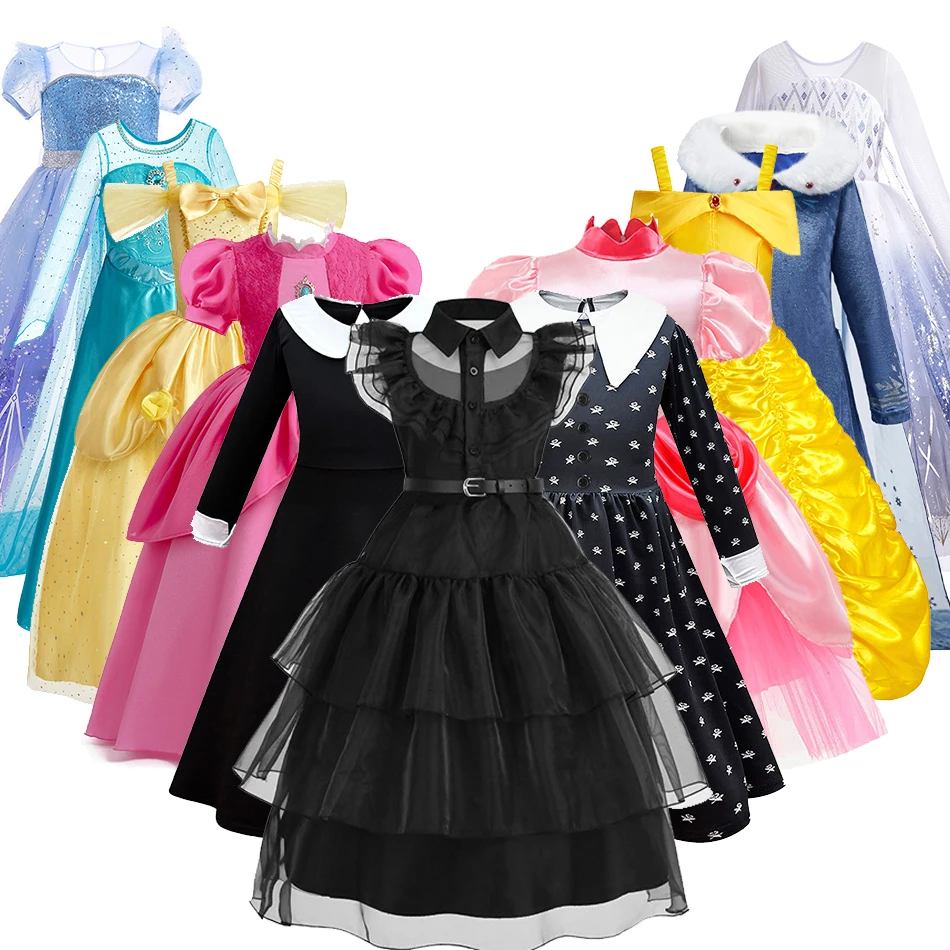 Enfants Elsa Anna Costume Fille Mercredi Barbi Peach Halloween Robe Enfants Cosplay Belle Déguisement Princesse Pageant Fantaisie 3-12T