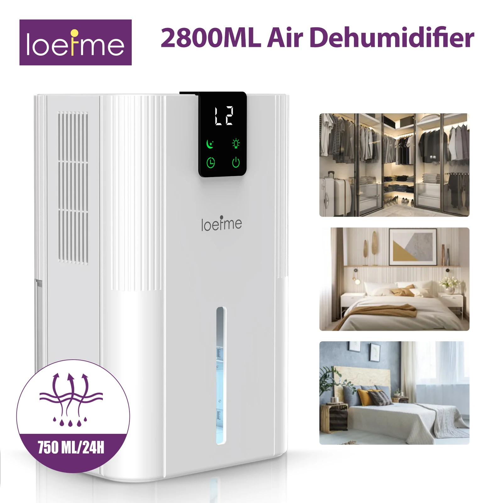 LOEFME 2,8L déshumidificateur d'air maison intelligente 750ML/24H déshumidificateur absorbeurs d'humidité avec écran tactile lumière LED dégivrage automatique