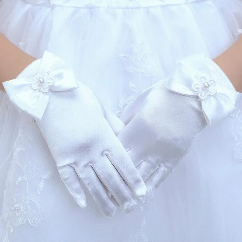 Mitaine de danse élastique avec nœud en dentelle pour enfants, performance isotSatin, fleur perlée, court, robe de mariée princesse, L44