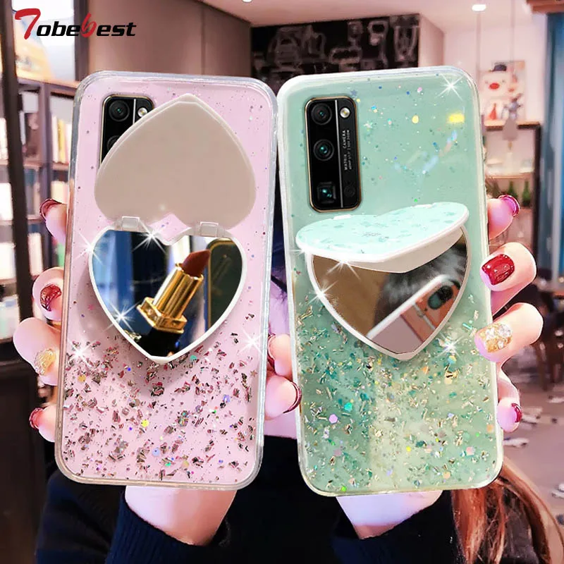 Coque de téléphone en silicone souple avec miroir et paillettes, étui pour Huawei Honor 30, 30S, 20 Pro, 10 Lite, 9, 8, 9X, 9C, 9A, 9S, 8A, 8X, 8C, 8S