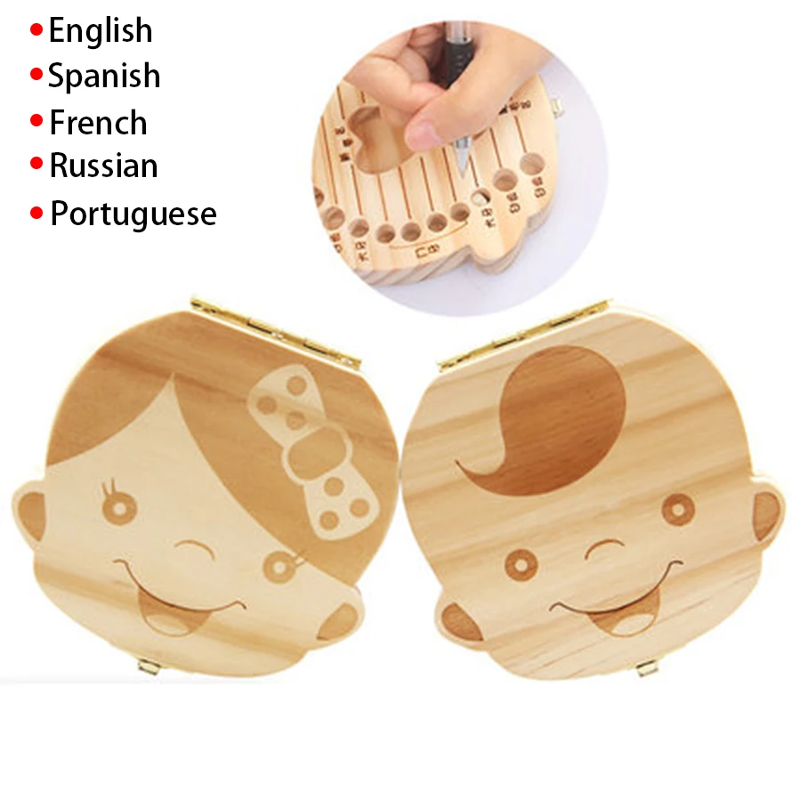 Espagnol/anglais/Portugal/français/russie bébé bois dent boîte organisateur lait dents stockage recueillir les dents Umbilica Lanugo économiser des cadeaux