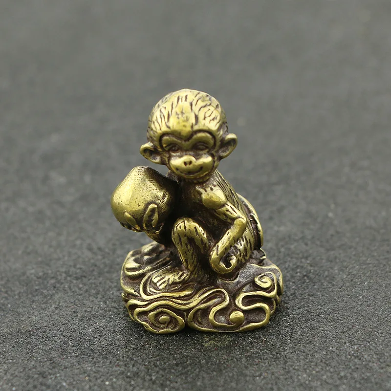 Statue d'animal vintage en laiton, mini singe mignon avec pêche, figurine en métal, accessoires de décoration de bureau à domicile, ornement de bureau, jouet cadeau