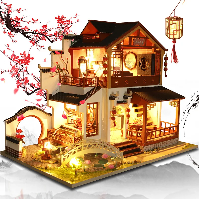 Maison de course en bois bricolage pour enfants, architecture de ville chinoise, mini-indicateur avec meubles, cadeau d'anniversaire pour un ami