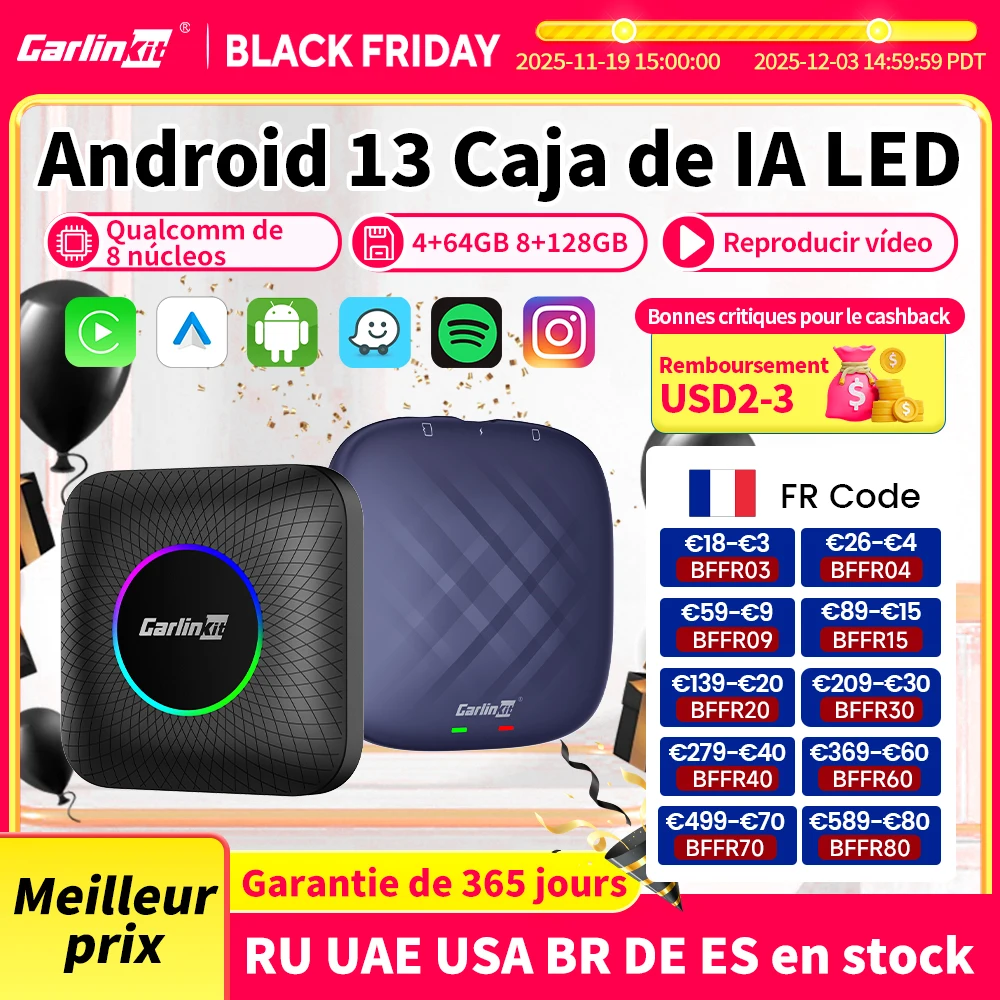 2025 CarlinKit CarPlay AI Box Android 13 SM6225 QCM6125 8 cœurs Android Auto Adaptateur CarPlay sans fil WiFi 4GLTE Connect GPS 64G 128G FOTA Mise à niveau pour voitures CarPlay filaires
