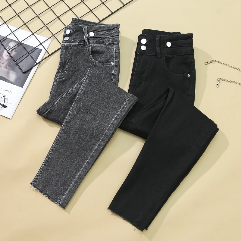 Jean slim taille haute pour femme, pantalon crayon, noir, gris, boutons, denim, grande taille, printemps, automne, fjStreetwear