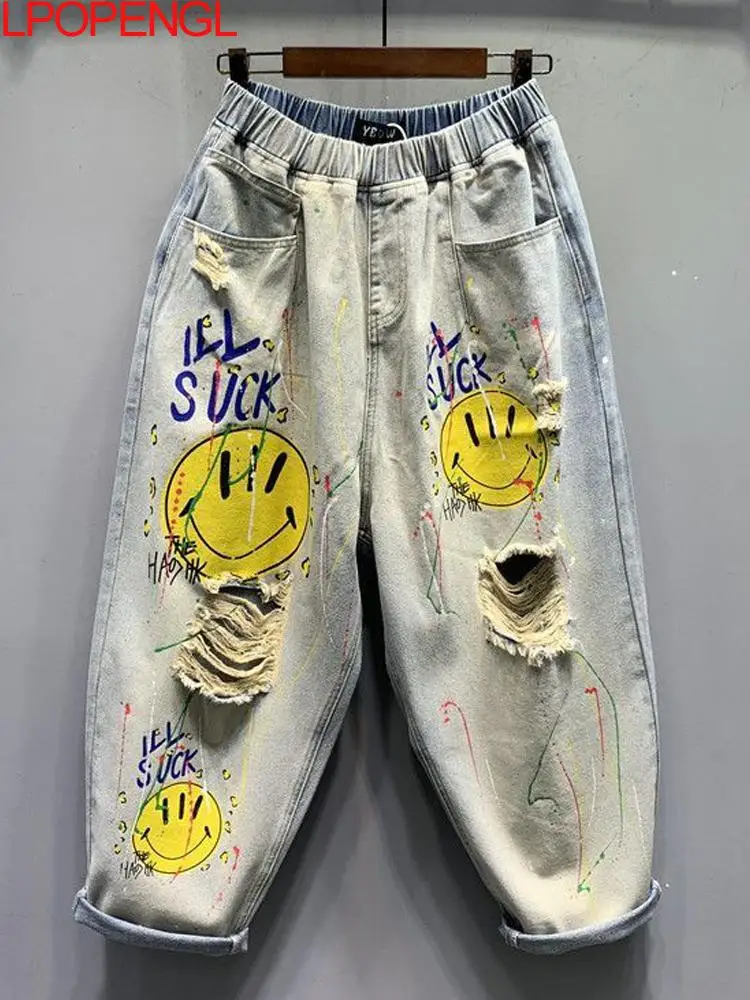 Jean déchiré et détresse pour femmes, Streetwear, imprimé, taille haute, ample, jambe droite, sarouel polyvalent, nouvelle collection été 2025