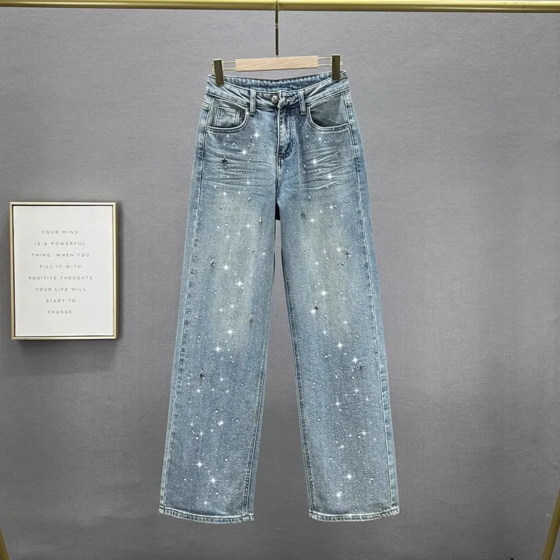 Mode femmes jean bleu taille haute diamant clouté pantalon en Denim droit printemps été femme Chic pantalon