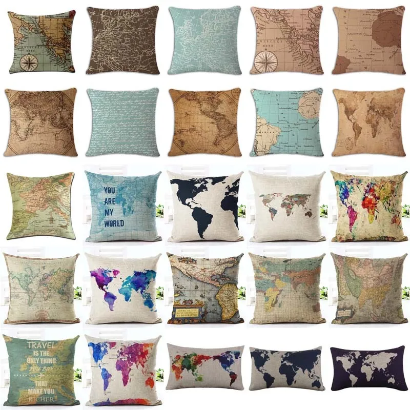 Housse de coussin de 18 pouces, style aquarelle vintage, motif carte du monde, en coton et polyester, housse de coussin, taie d'oreiller, pour la maison D