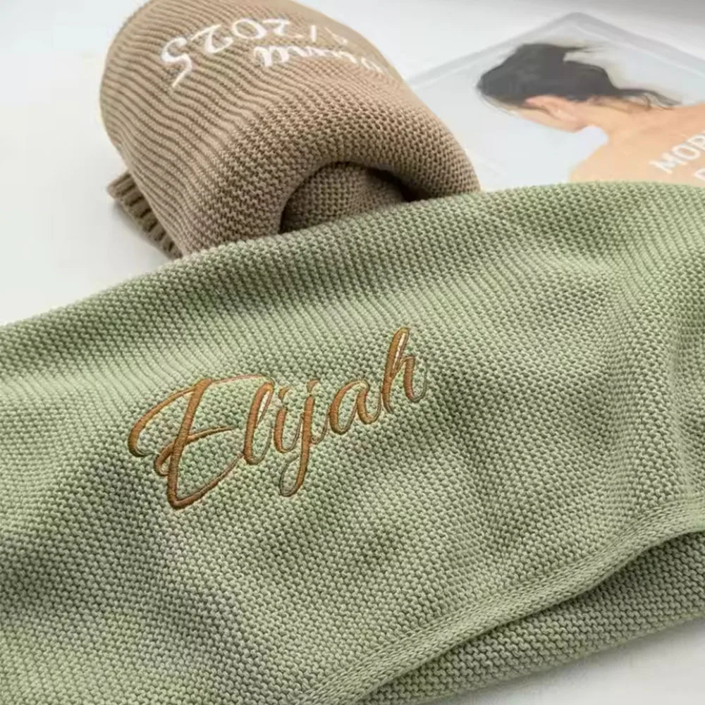 Couverture de bébé personnalisée avec nom d'enfant, couverture brodée pour nouveau-né, emmaillotage de poussette, couverture tricotée en coton respirant, literie