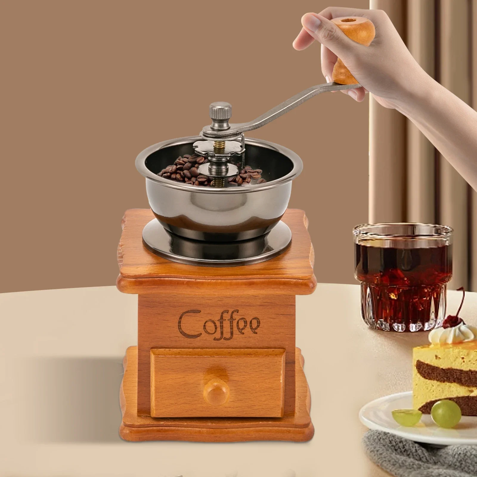 Moulin à café manuel en grains, moulin à café manuel rétro marron Portable sur bois avec manivelle