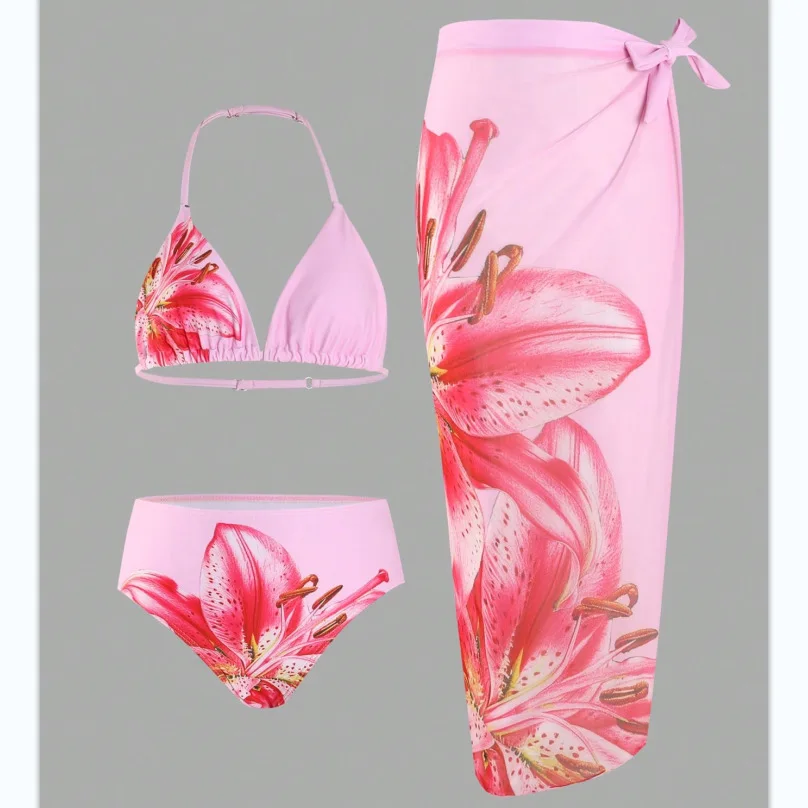 Maillot de bain rose taille haute pour enfants de 8 à 12 ans, ensemble de 3 pièces pour adolescents, bikini avec jupes, couverture de plage