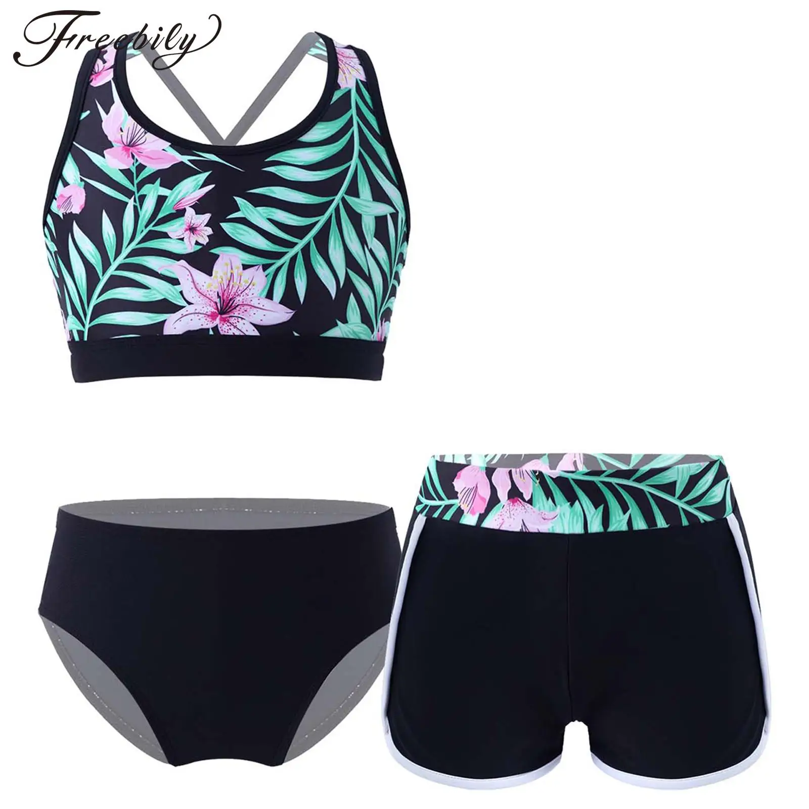 Maillot de bain imprimé pour adolescentes, bretelles croisées, haut court avec short, slip, ensemble de plage, piscine, parc aquatique, protection contre les éruptions cutanées