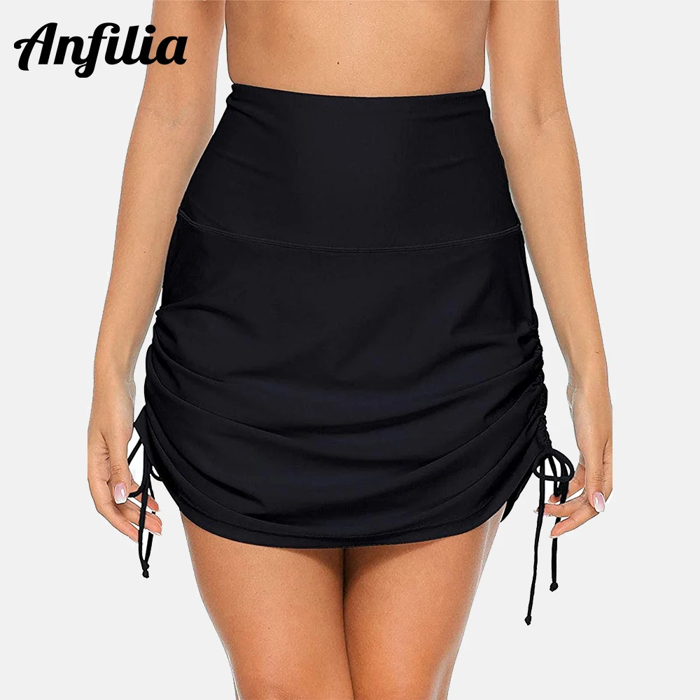 Anfilia Jupes de bain pour femme avec slip intégré Taille haute Short de bikini avec cordon de serrage froncé Contrôle du ventre Bas de maillot de bain