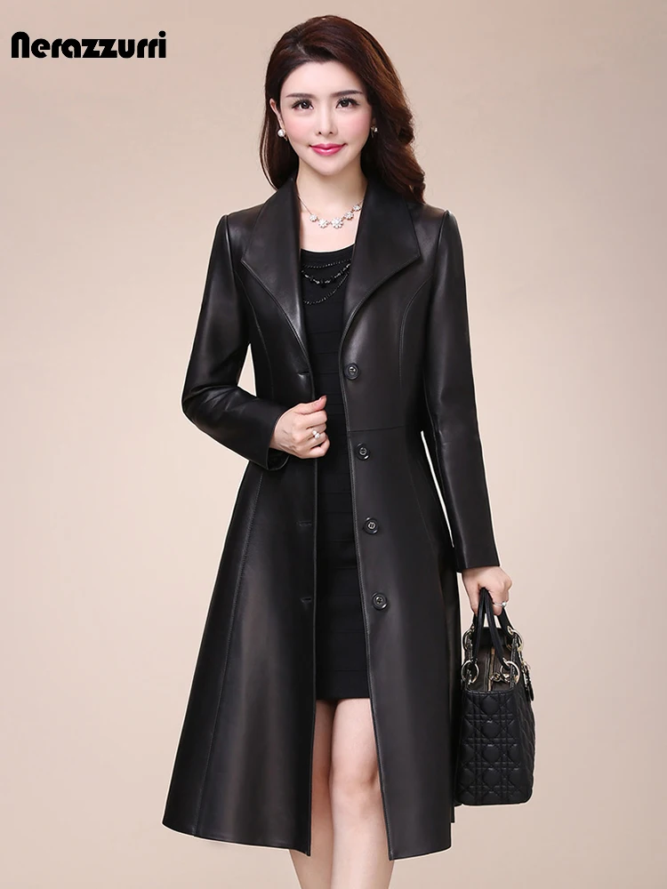Nerazzurri-Manteau Long Noir en Faux Cuir Doux pour Femme, Manches sulf, lèvent, Coupe Cintrée, Veste Élégante, Printemps Automne 2021