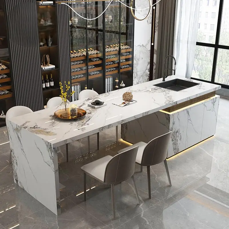 Table d'îlot de cuisine de luxe avec comptoir à quartz et évier intégré, barre haute et portante résistante à la chaleur pour la maison moderne