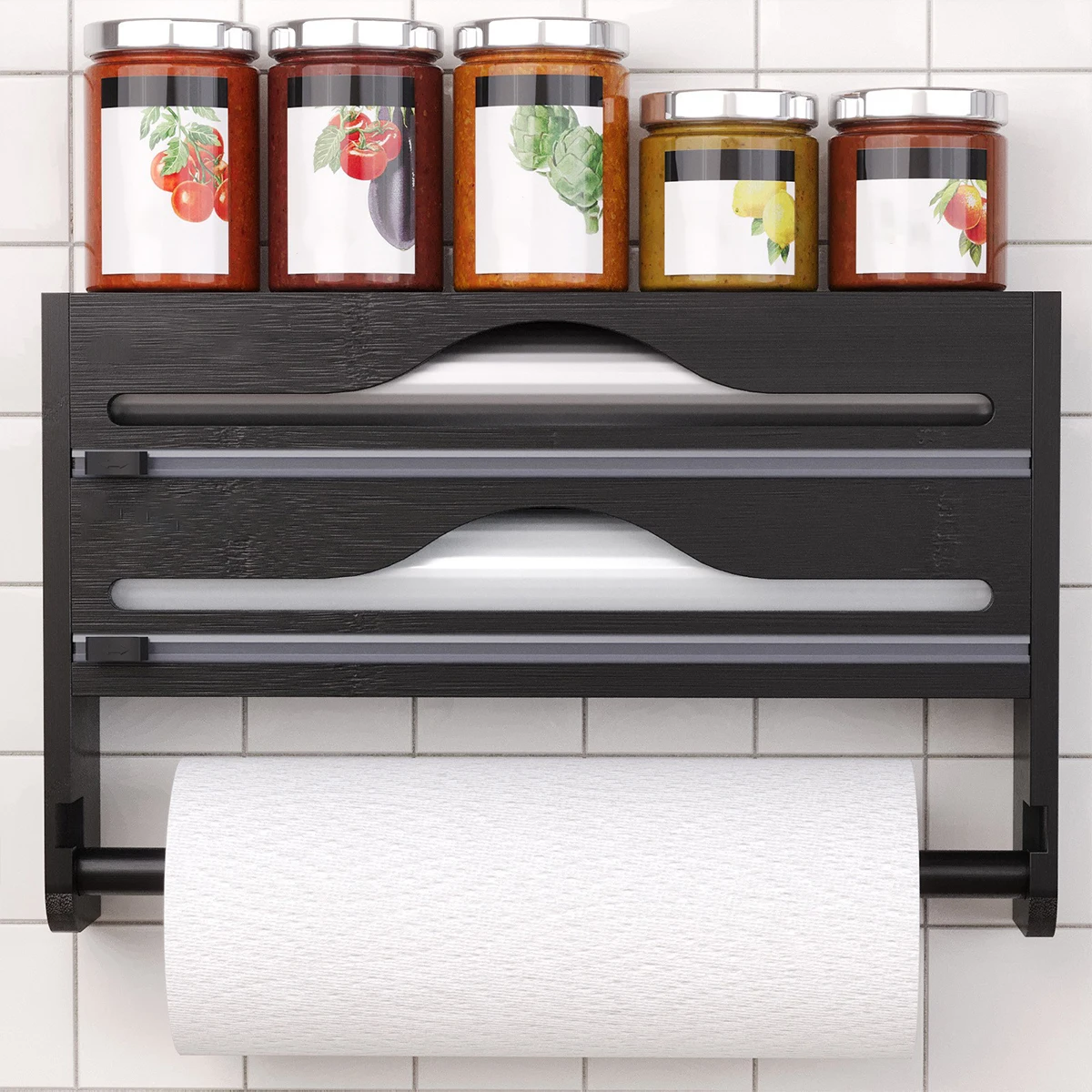 Organisateur de cuisine en bambou, distributeur de films adhésifs et de feuilles avec coupe, support de rangement mural pour cuisine et salle à manger