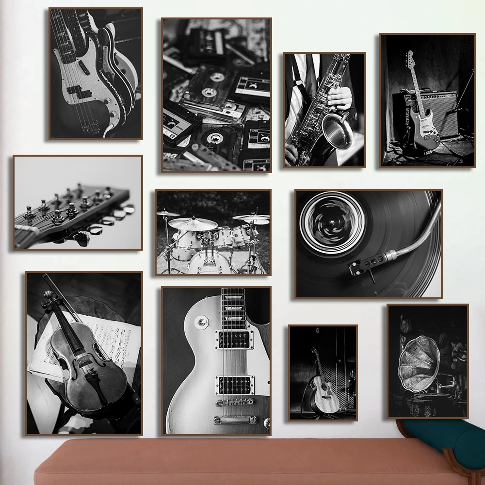 Noir et blanc Photo tambours guitare disques Albums violon toile peinture musique affiche pour salon décor à la maison Cuadros cadeau