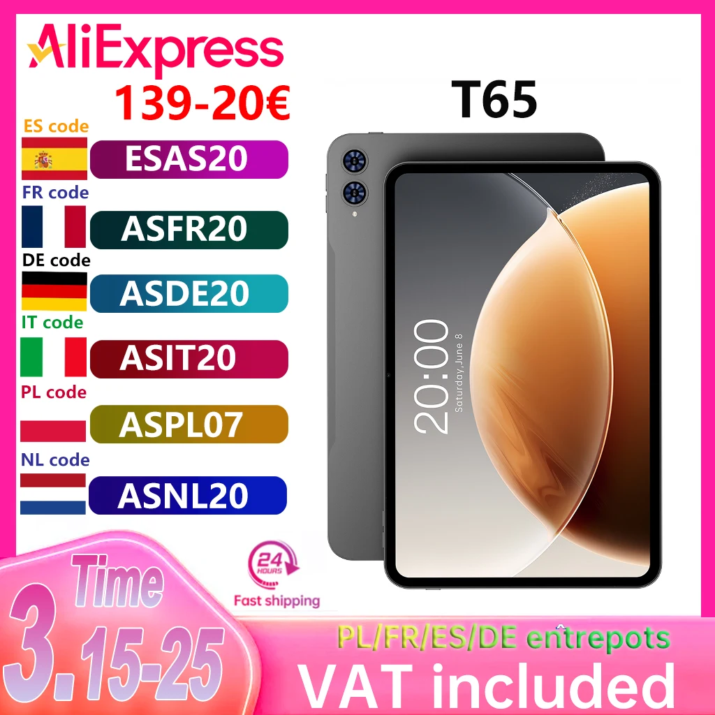 Tablette Teclast T65 13,4 pouces Android 16 Écran 1920x1200 120Hz Processeur T7280 8 cœurs 18 Go de RAM (6 Go + 12 Go) 256 Go de ROM 4G LTE GPS 8000 mAh Type-C