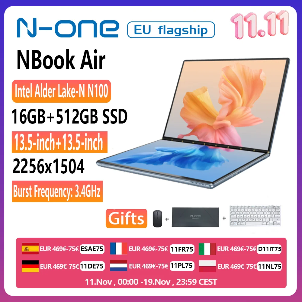 2024 N-one NBook air Windows 11 Intel N100 double écran tactile 13.5 pouces 2 en 1 ordinateur portable 16 Go + 512 Go