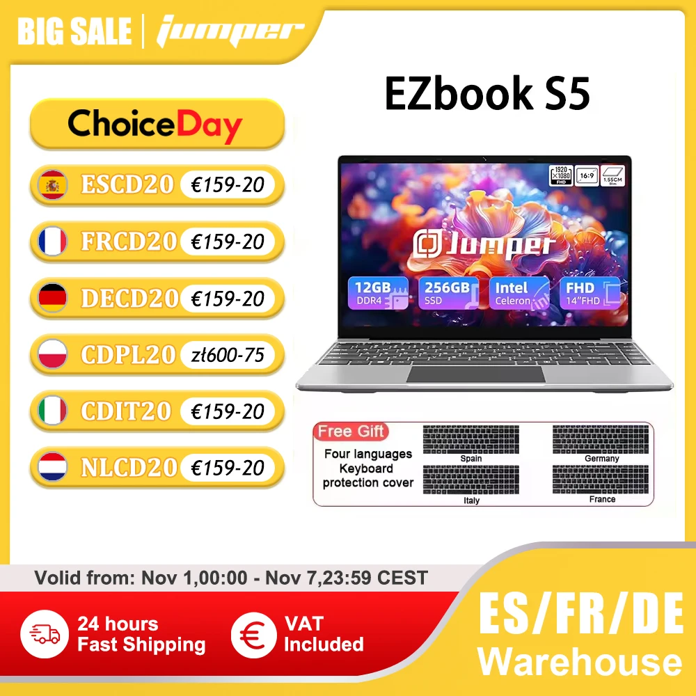 Jumper EZbook S5 ordinateur portable 14 pouces, 12 Go de RAM 256 Go SSD, processeur Intel Celeron J4105 ordinateur portable, deux haut-parleurs, type-c, mini HDMI