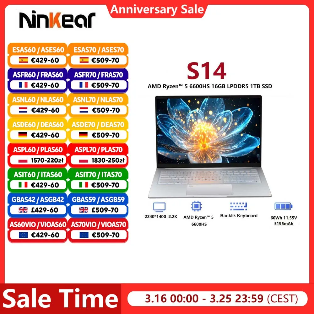 Ordinateur portable Ninkear S14 14 pouces, tablette AMD Ryzen ™ Ordinateur portable 5 7535HS 16 Go LPDDR5 1 To SSD Wifi 6 Reconnaissance d'empreintes digitales