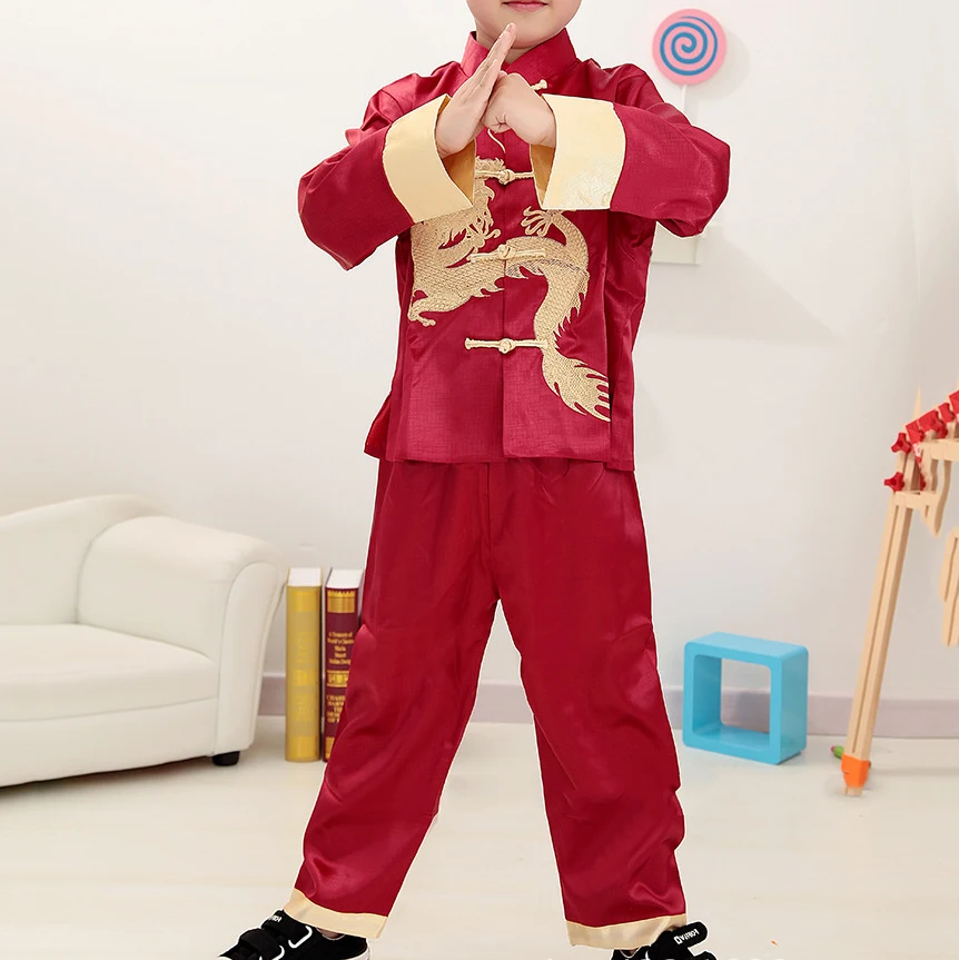 Costume Tang en Satin pour enfants, 2 pièces, Vintage, broderie Dragon Kong Fu, vêtements chinois, col Mandarin, décontracté, chemise et pantalon