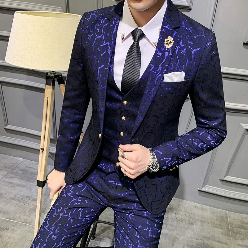 Ensembles de costumes de luxe pour hommes, dernier manteau, pantalon, gilet, Design, robe florale, Slim, costume de smoking pour marié, bleu Royal, bordeaux