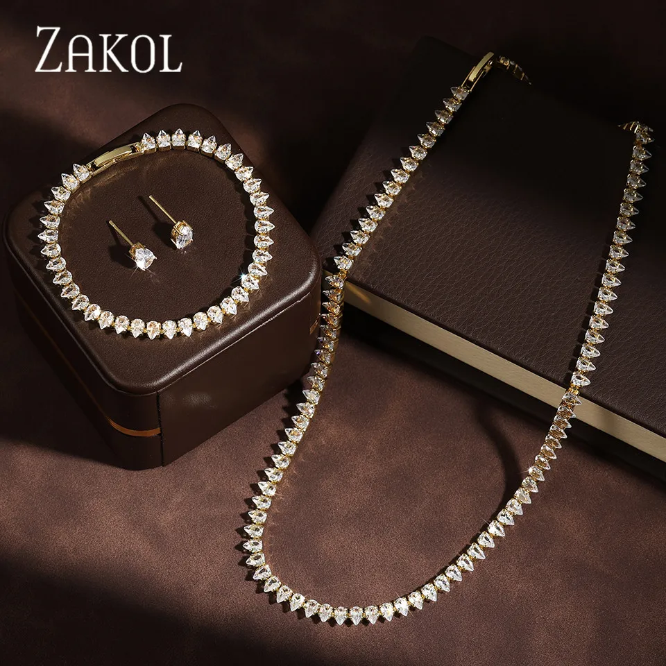 ZAKOL minimaliste cubique zircone goutte d'eau collier boucles d'oreilles Bracelet ensemble pour les femmes de luxe élégant mariée fête de mariage bijoux