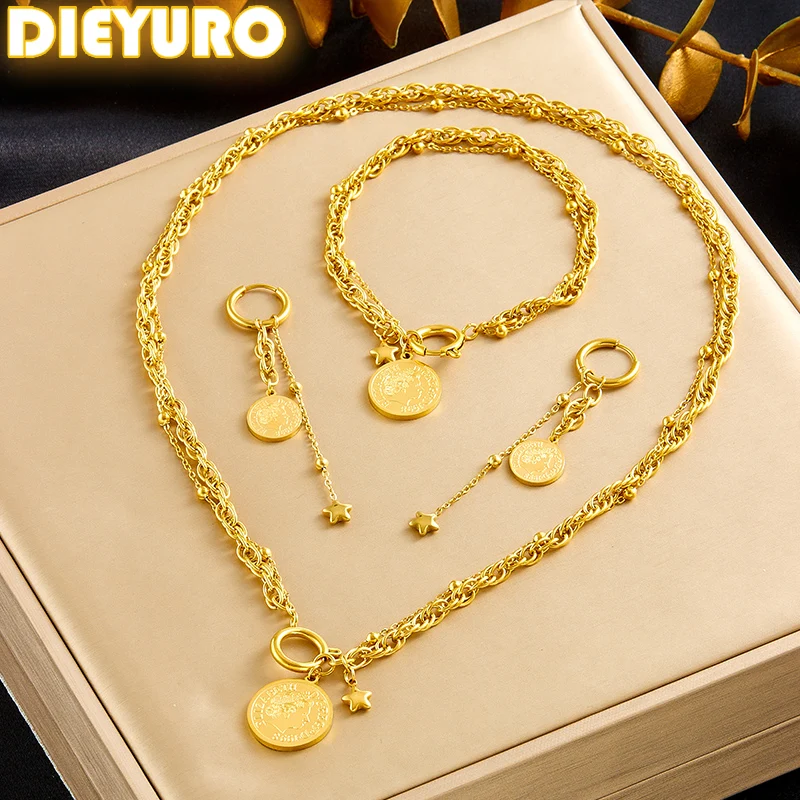 DIEYURO 316L acier inoxydable étoile dorée Portrait suspendu pièce collier boucles d'oreilles Bracelet ensemble femmes nouvelle mode bijoux cadeau