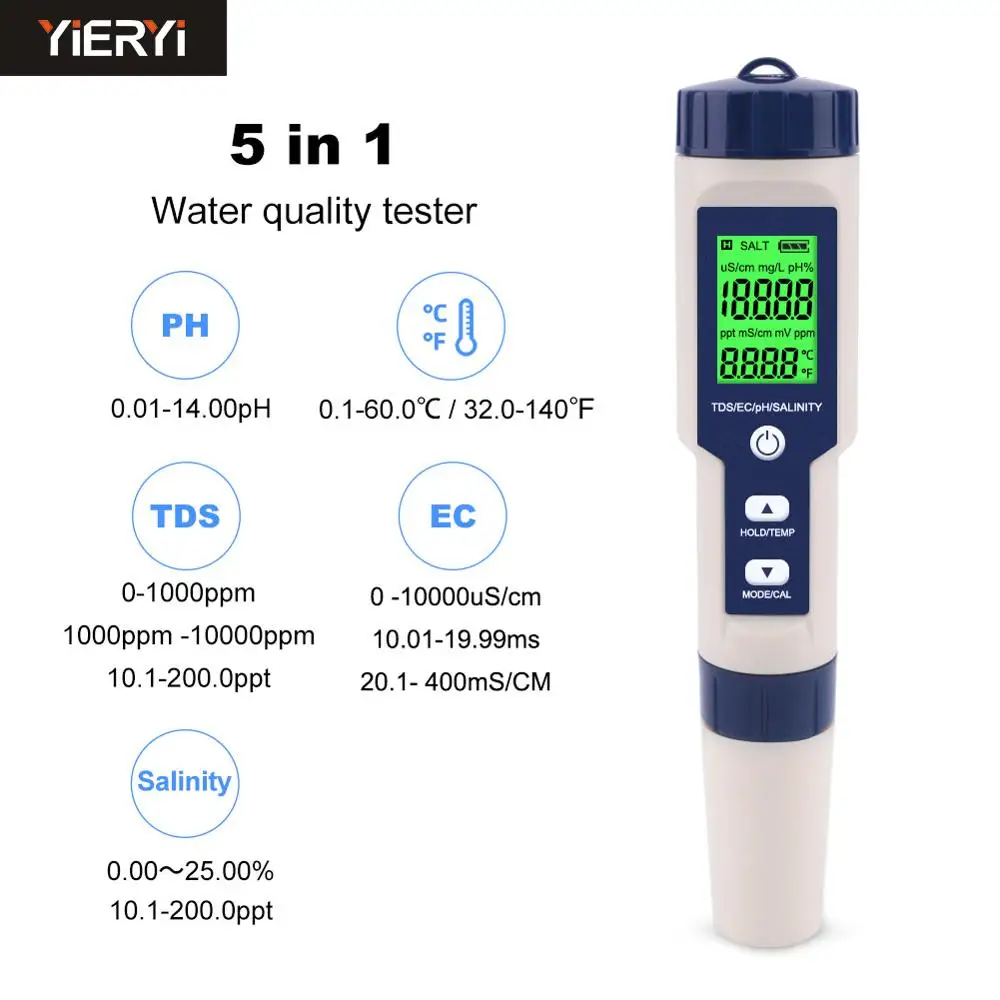 Testeur numérique de qualité de l'eau 5 en 1, TDS/EC/PH/salinité/température, pour piscines, eau potable, Aquariums