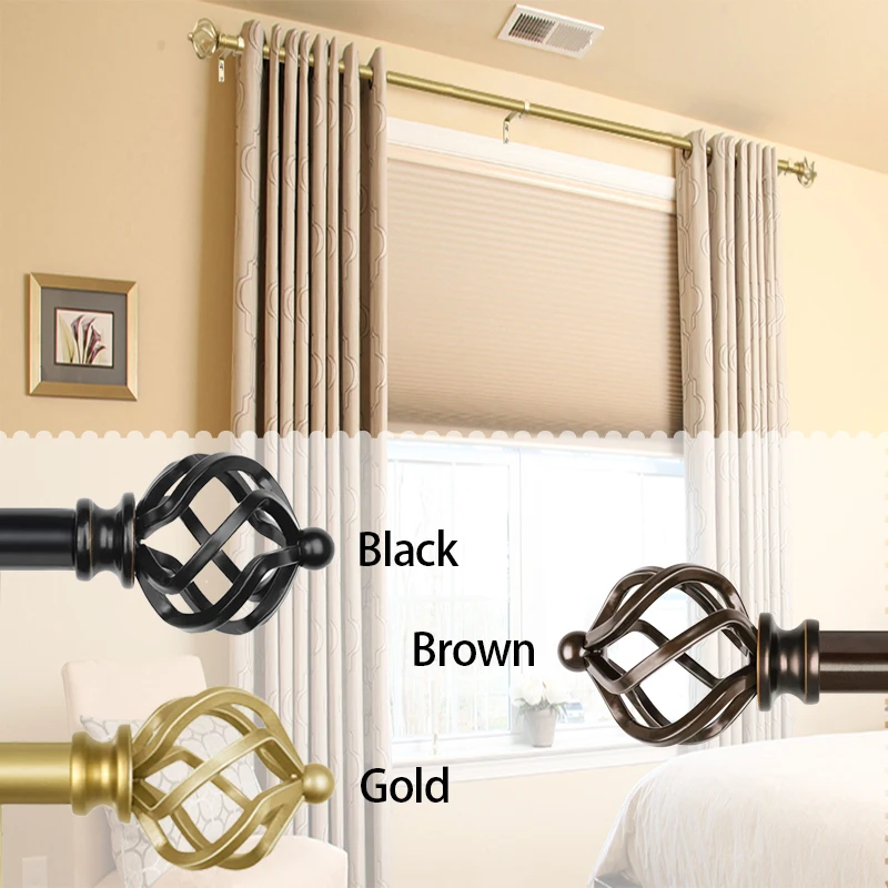 Un ensemble de tringles à rideaux noires, dorées et brunes de 18 à 120 pouces pour fenêtres avec une nouvelle garniture de tringle à rideau au Design creux