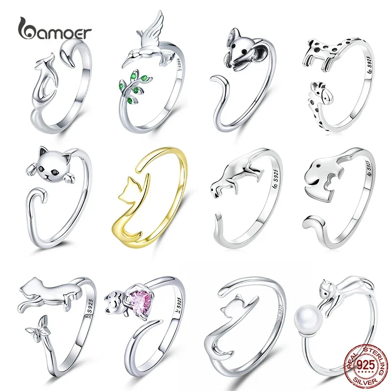 Bamoer – bague chat et souris en argent Sterling 925 véritable pour femmes, anneau Animal ouvert S925, accessoires de bijoux fins pour filles
