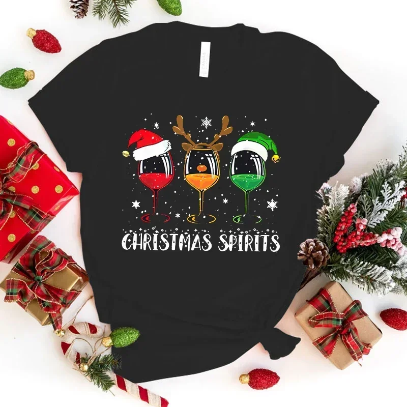 T-shirt graphique unisexe imprimé verre à vin rouge, T-shirt décontracté à manches courtes, Spirits de Noël, T-shirt haut de gamme, Mode, Nouveau