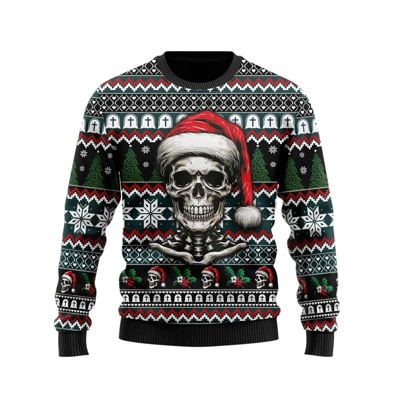 Sweat-Shirt à Col Ras du Cou avec Motif de Crâne de Père Noël, Vêtement Unisexe avec Modules Amusants PVD, pour Vacances de Noël