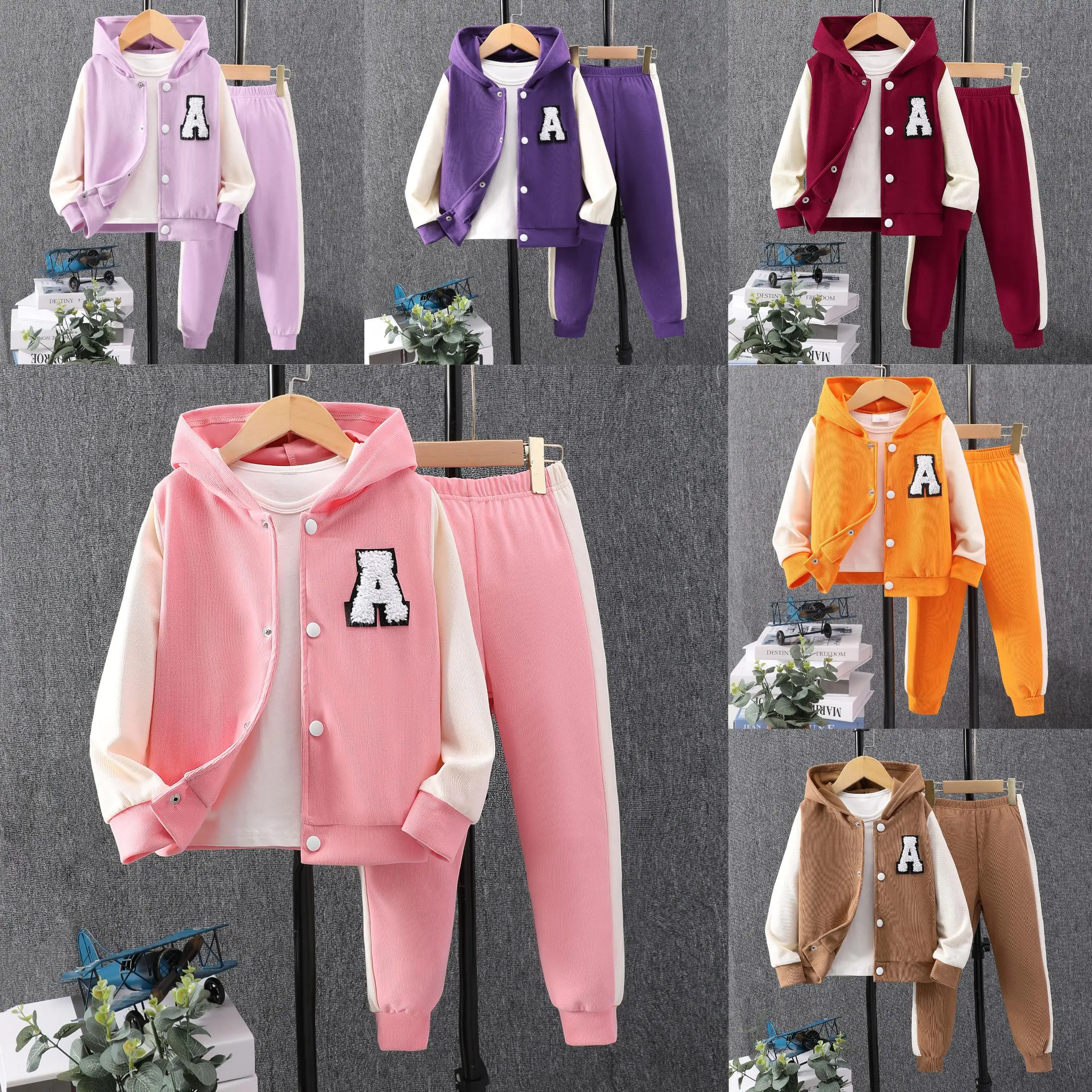Ensemble de choc de couleurs élégant pour petites filles, 2 pièces, veste universitaire confortable à capuche et pantalon de survêtement en velours côtelé doux, Ensemble parfait pour enfants