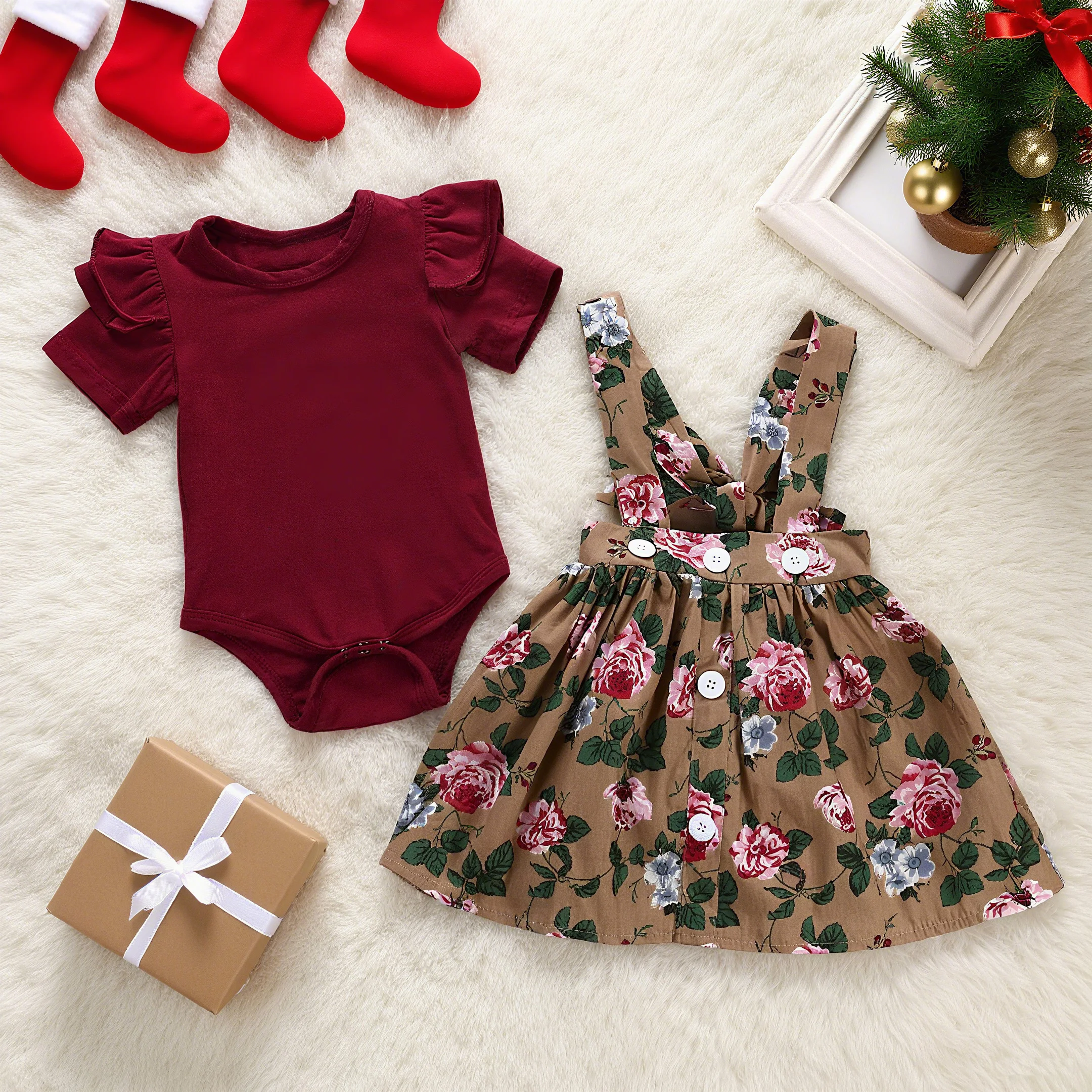 Ensemble de vêtements de noël pour nouveau-né fille de 0 à 18 mois, 3 pièces, barboteuse à manches courtes + jupe à bretelles + bandeau