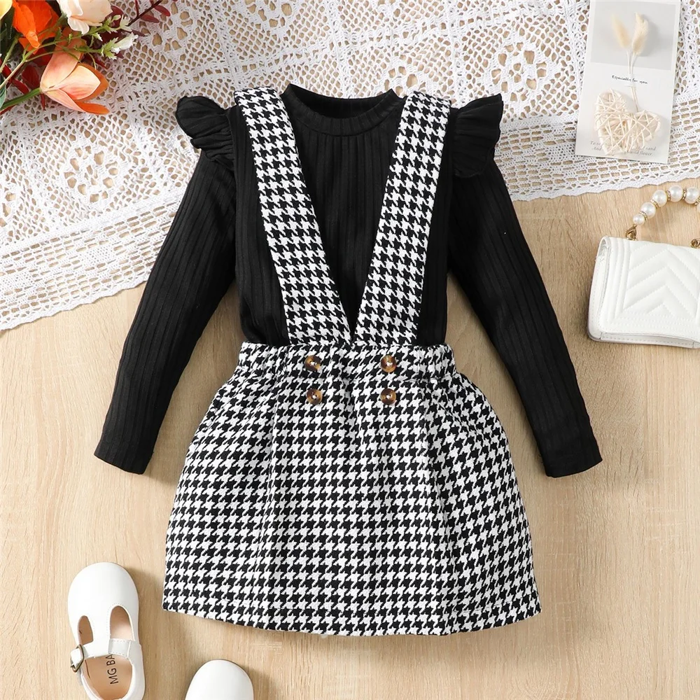 Ensemble de jupe Ă carreaux Ă manches longues et rayures noires pour filles, tenue de fĂŞte mignonne, vĂŞtements assortis, mode, automne, hiver, enfant de 2 Ă 7 ans