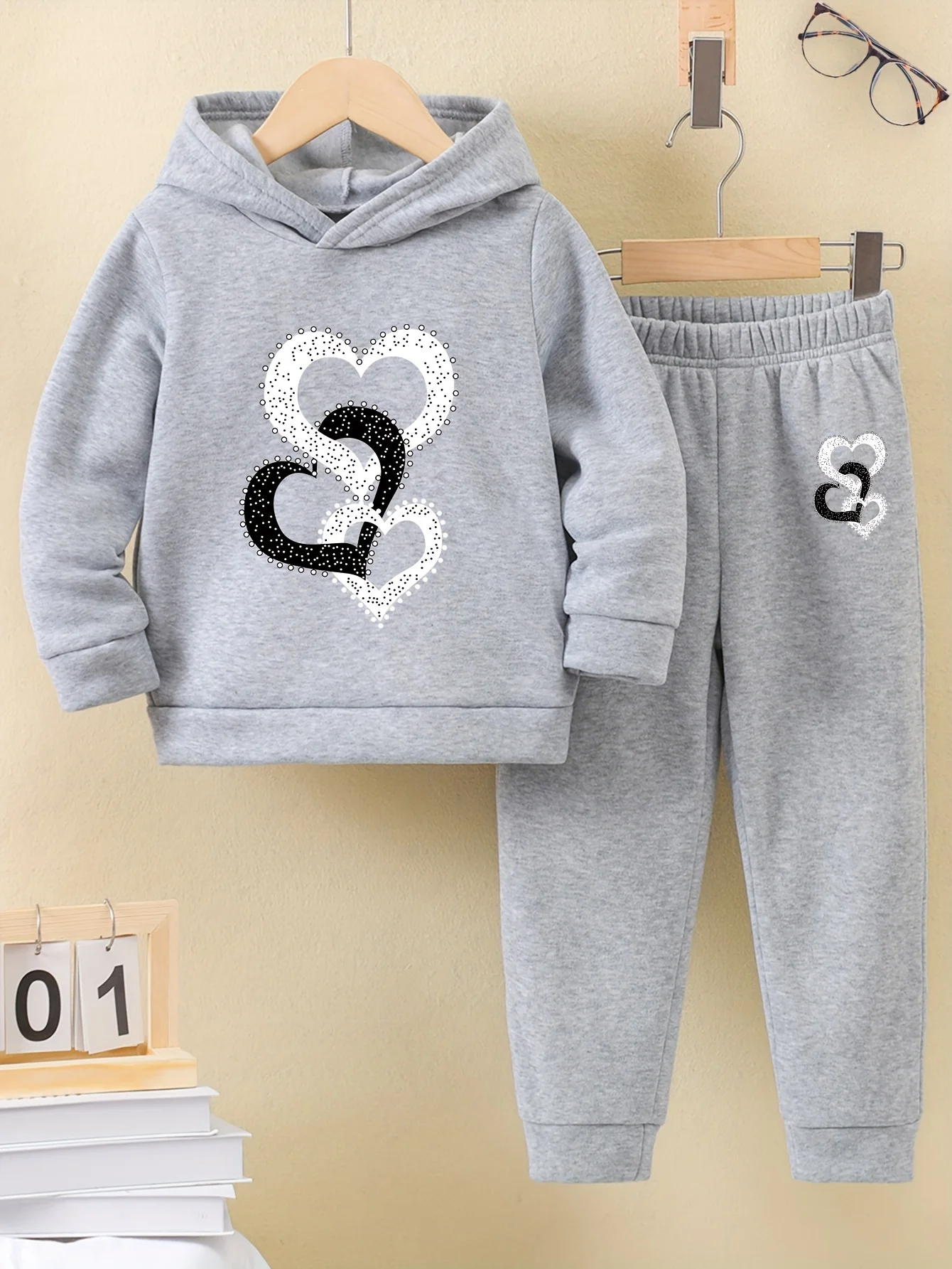 2 ensembles filles automne et hiver mignon doux décontracté mode amour motif imprimé chaud plus polaire sweat à capuche et pantalon de survêtement